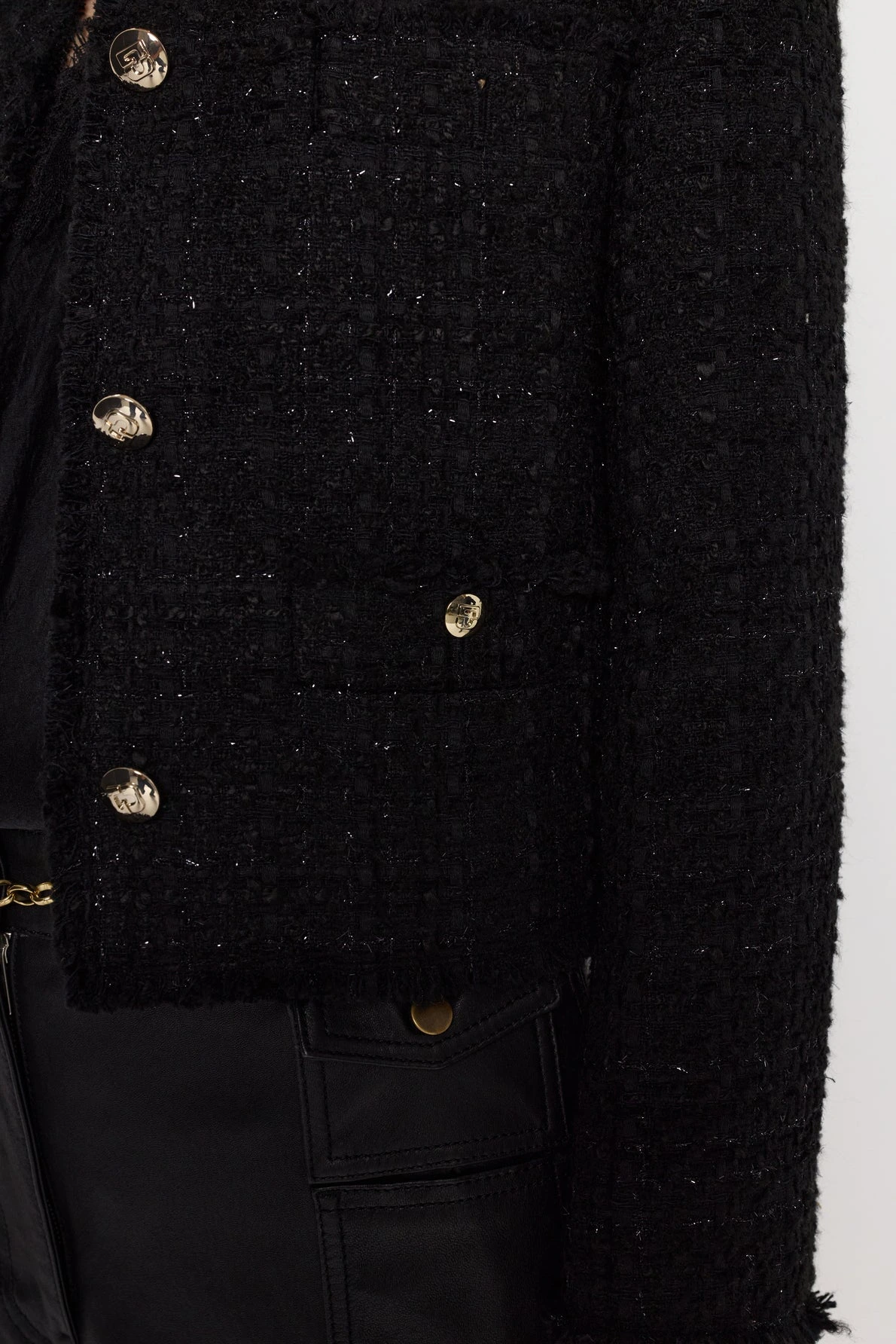 Déclinée en noir rehaussé d’une pointe de lurex, ornée de finitions effilochées, la veste sans col en tweed Nessa allie l’élégance classique à un look contemporain.