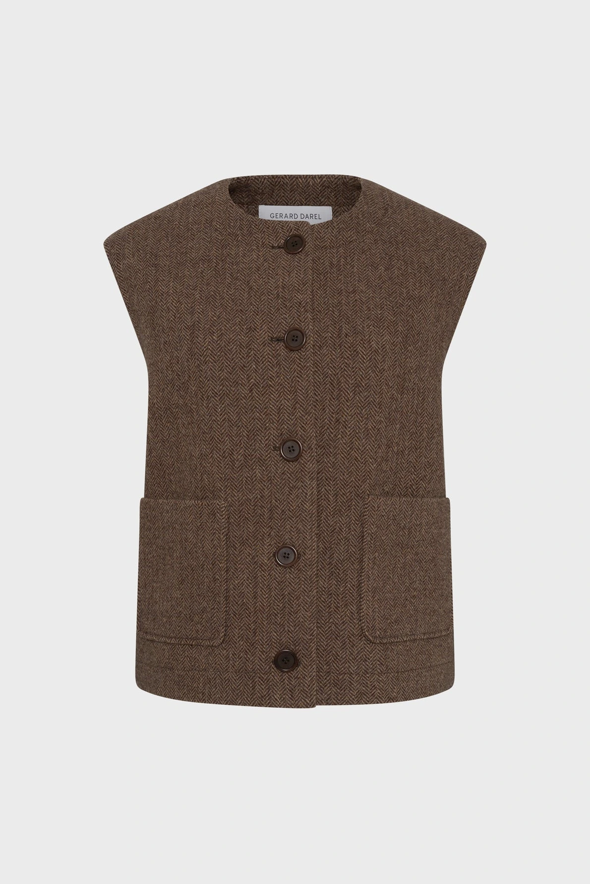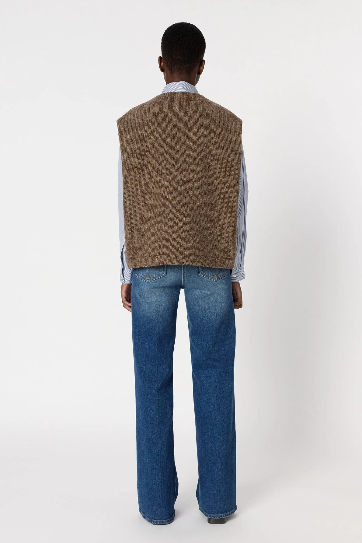 Confectionnée en 100% laine vierge, cette veste sans manche à chevrons est ornée de chevrons dans des tons de beige et marron. Inspirée du vestiaire masculin, elle pourra se porter sur un pull ou un chemisier blanc pour la féminiser.