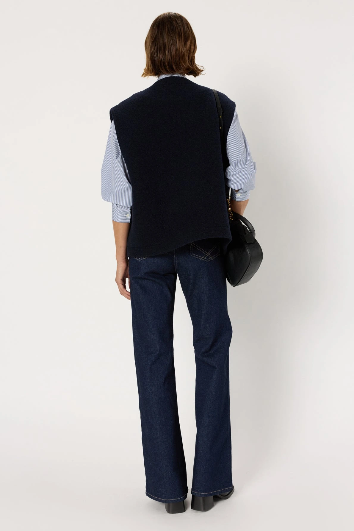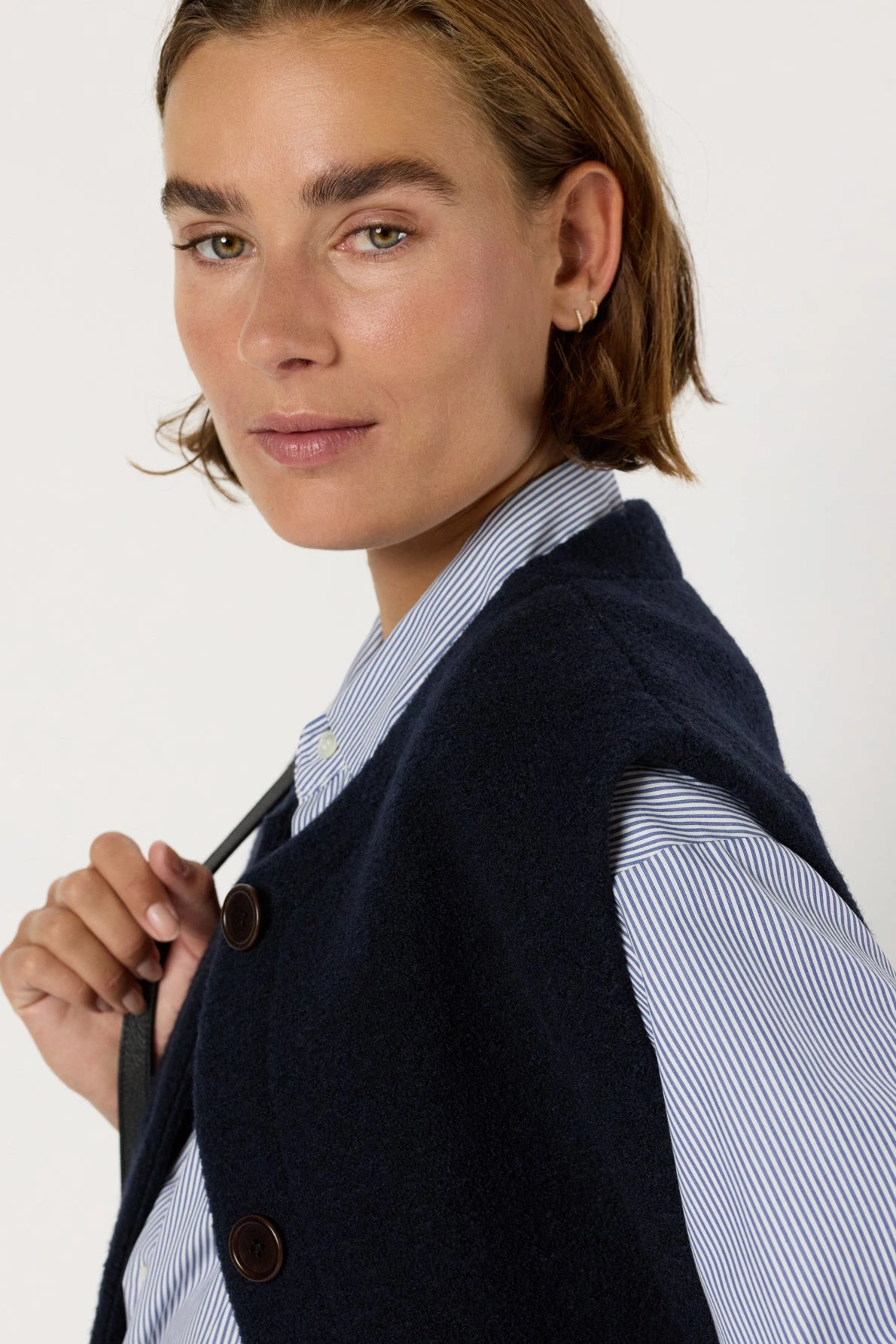 Confectionnée en 100% laine vierge, cette veste sans manche en laine bouclette allie le style au confort. Déclinée en bleu marine, elle peut se porter à l’entrée de saison sur un pull ou en plein hiver sous un manteau.